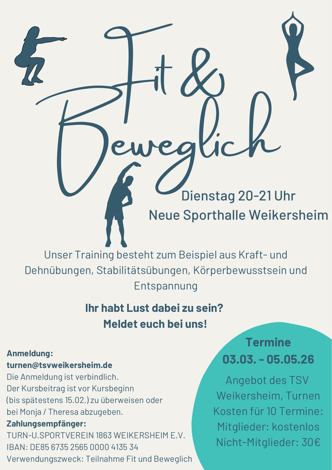 Kosten für 10 Termine: für Mitglieder kostenlos oder 30€/Kurs